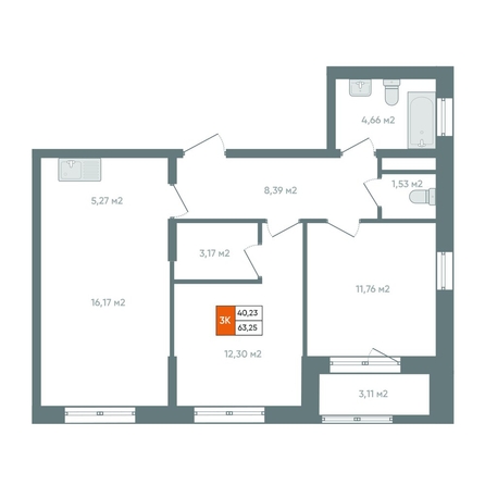 Продаётся 3-комнатная квартира 68,53 м2 напрямую от застройщика в жилом комплексе «Автор».
