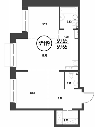 Общая площадь квартиры — 59.66 кв.м. Компания-застройщик — ГРАНДСТРОЙ.
