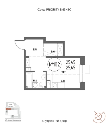 Общая площадь квартиры — 25.45 кв.м. Компания-застройщик — ГРАНДСТРОЙ.