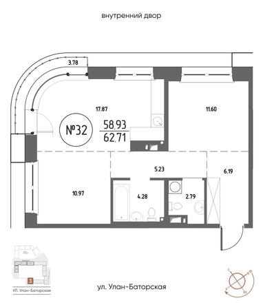 Общая площадь квартиры — 62.71 кв.м. Компания-застройщик — ГРАНДСТРОЙ.