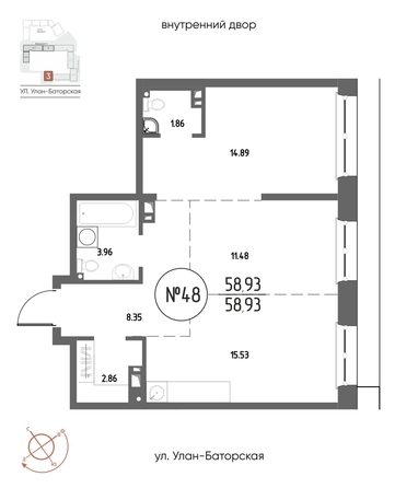 Общая площадь квартиры — 58.93 кв.м. Компания-застройщик — ГРАНДСТРОЙ.