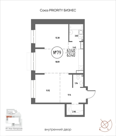 Общая площадь квартиры — 63.4 кв.м. Компания-застройщик — ГРАНДСТРОЙ.