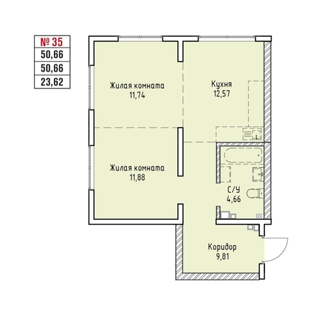 Двухкомнатная квартира классической планировки с отдельной кухней-гостиной. На чётных этажах (с 4-го по 14-й) из кухни предусмотрен выход на французский балкон. Расположение квартиры — угловое, с выходом на солнечную сторону. Жилые комнаты имеют правильную квадратную форму. Санузел совмещённый.