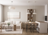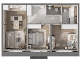 Прямоугольная евро«трёшка» с кухней-нишей и вместительным двойным санузлом, размещённым углом. Именно такое расположение позволит сделать в ближайшей комнате мастер-спальню для семейной пары: современное и комфортабельное решение. В центральной комнате может быть выход на французский балкон, чтобы любоваться ранними летними или поздними зимними восходами. Соседнее помещение может использоваться как гостиная-столовая или в качестве жилой комнате.