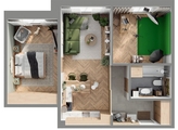 Прямоугольная евро«трёшка» с кухней-нишей для семьи с одним или двумя однополыми детьми. Жилые комнаты прямоугольной формы, окна выходят на запад, на ул. Култукскую. Санузел совмещенный. В коридоре удобная ниша под шкаф-купе.